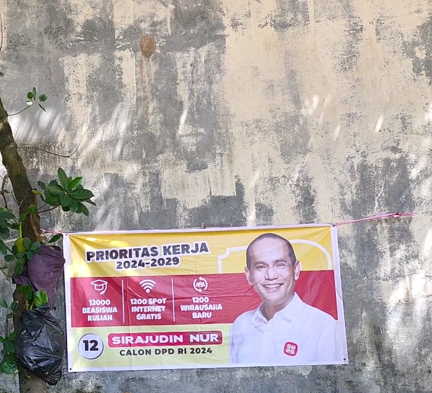 “Kandidat dari partai Nasdem yang mengusung, Caleg atas nam Suhadi .ST, memasang spanduk di tembok SMP 10 sungai panas dan spanduk Sirajudin untuk DPD RI.