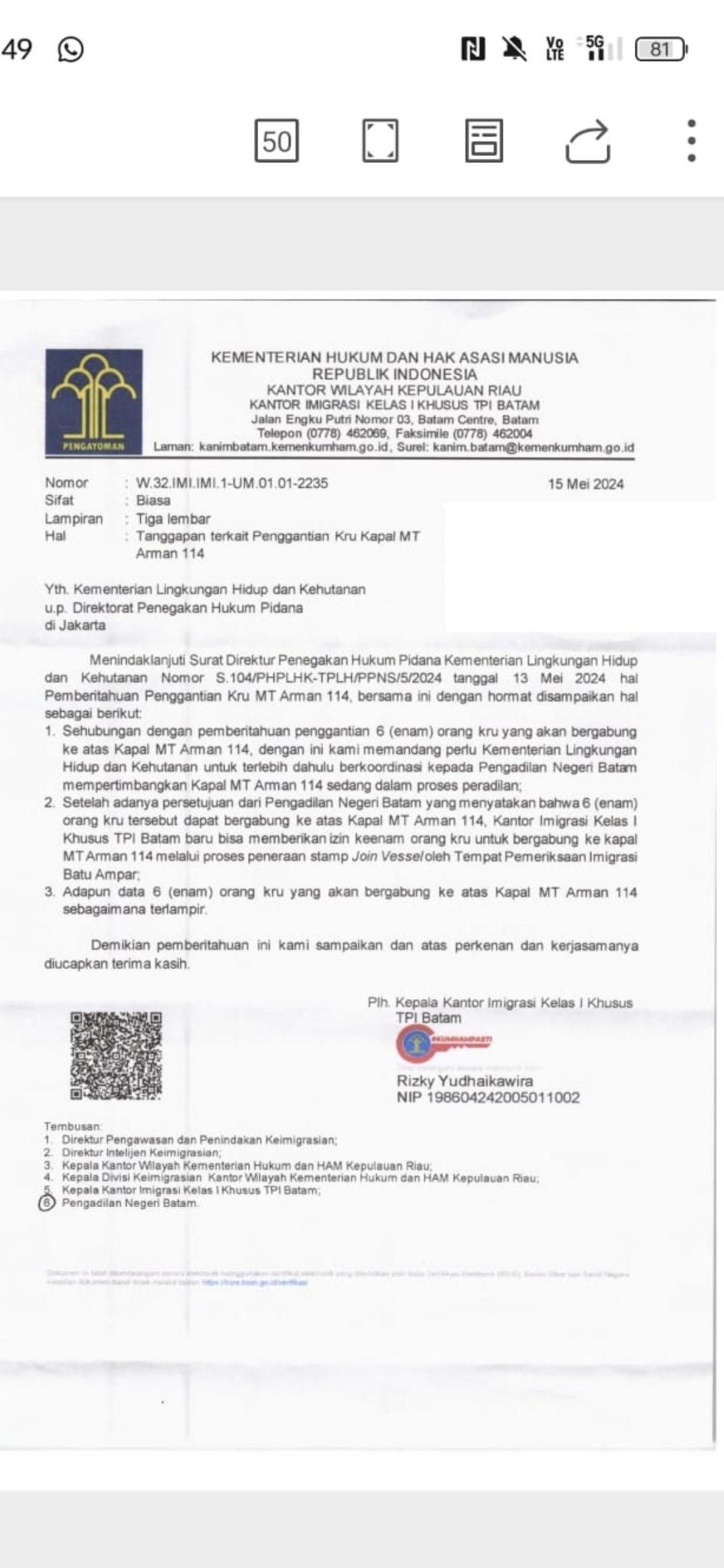 Batam, wbnnews – Kementerian Lingkungan Hidup dan Kehutanan (KLHK) baru-baru ini mengirimkan surat kepada beberapa instansi terkait untuk melakukan intervensi dalam upaya menaikkan 21 kru ke dalam kapal tanker MT Arman 114. Langkah ini diduga kuat sebagai upaya kolaborasi antara KLHK dengan perusahaan agen pelayaran tertentu untuk mengambil alih kendali kapal. (24/5/24)
