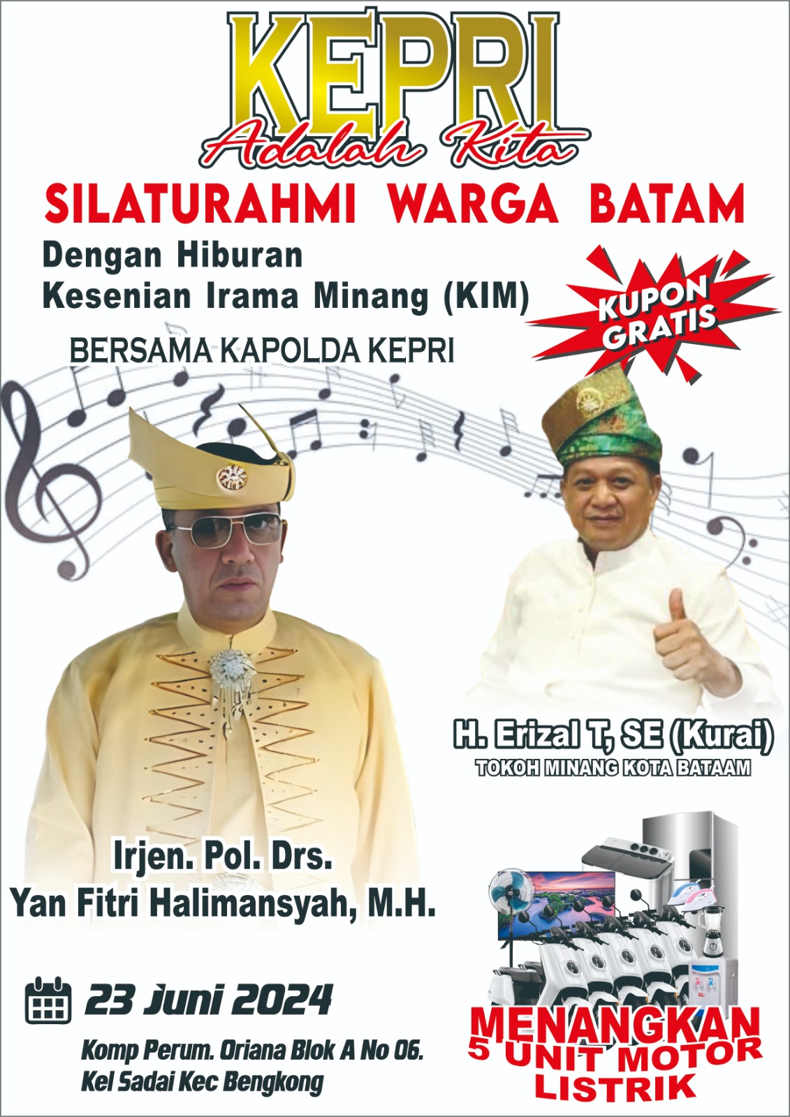 Batam, 24 Juni 2024 – Masyarakat Batam, terutama warga rantau Minang, menikmati kemeriahan pesta rakyat yang diselenggarakan di Perumahan Oriana Ocarina, Batam Center. Acara ini diadakan dalam rangka khitan anak dari Haji Erijal Kurai, Ketua Asosiasi Pedagang Kaki Lima, dan dihadiri oleh Kapolda Kepri, Irjen Yan Fitri.