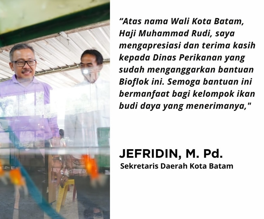 “Atas nama Wali Kota Batam, Haji Muhammad Rudi, saya mengapresiasi dan terima kasih kepada Dinas Perikanan yang sudah menganggarkan bantuan Bioflok ini. Semoga bantuan ini bermanfaat bagi kelompok budi daya ikan yang menerimanya,” ucapnya.