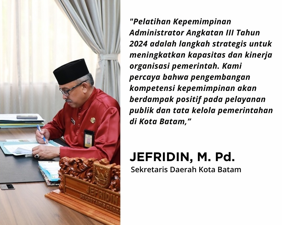 “Pelatihan Kepemimpinan Administrator Angkatan III Tahun 2024 adalah langkah strategis untuk meningkatkan kapasitas dan kinerja organisasi pemerintah. Kami percaya bahwa pengembangan kompetensi kepemimpinan akan berdampak positif pada pelayanan publik dan tata kelola pemerintahan di Kota Batam,” katanya.Selain itu, pemutakhiran pendataan keluarga2024 adalah bagian penting dari upaya Pemerintah Kota Batam untuk memastikan setiap keluarga mendapatkan perhatian yang layak dan pelayanan yang tepat. Ia berharap masyarakat dapat berpartisipasi aktif dan memberikan informasi yang akurat untuk mendukung tujuan bersama ini.Data yang terkumpul akan sangat penting dalam menentukan kebijakan pemerintah,memberikan pelayanan yang tepat sasaran,serta melakukan survei indeks perkembangan anak usia dini. Jefridin mengimbau kepada