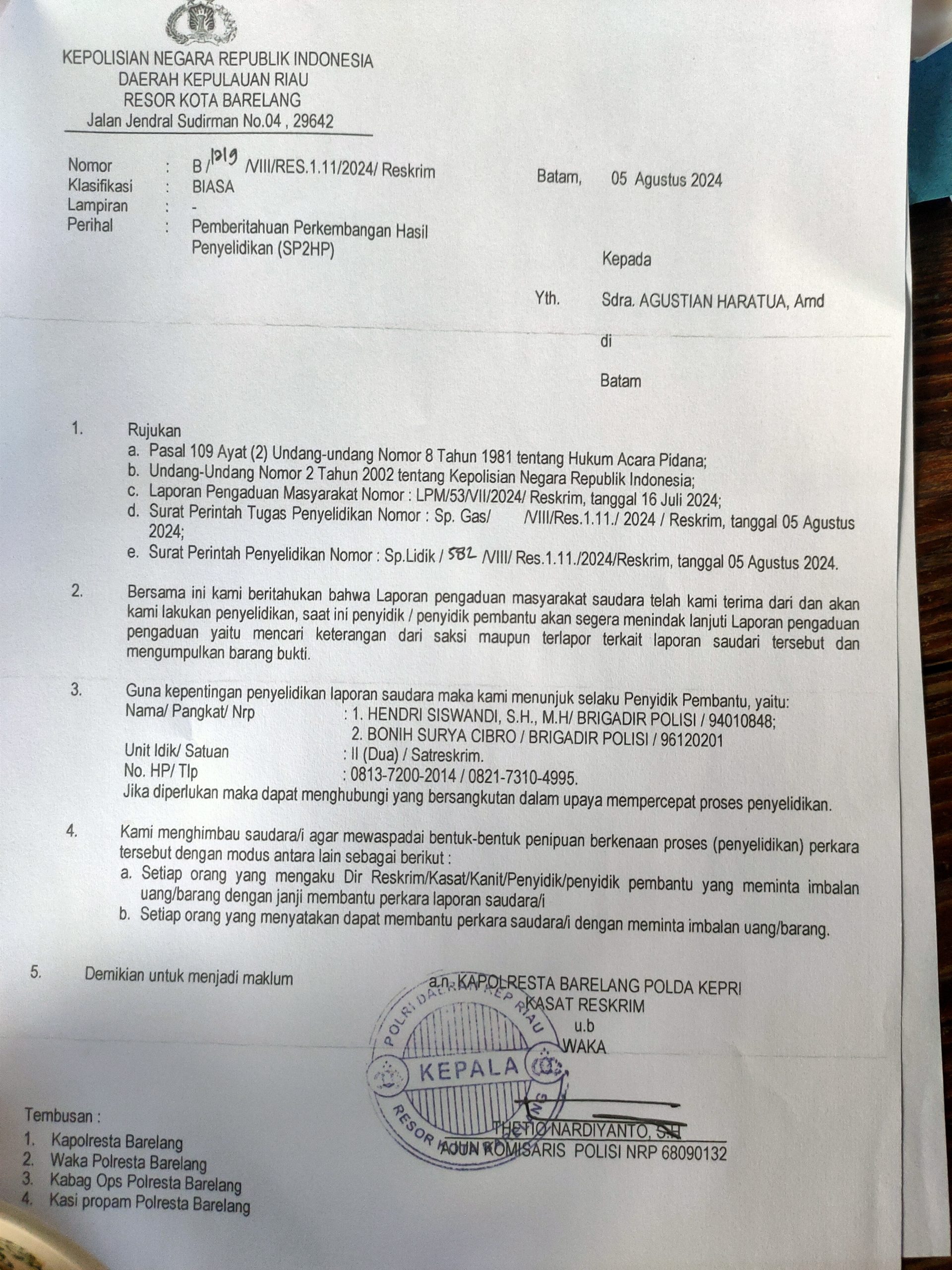 Batam — Laporan dugaan penipuan dan atau penggelapan