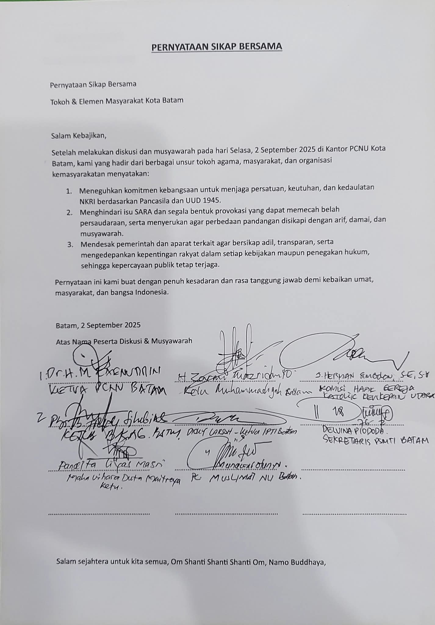 Lebih lanjut, Zainuddin menegaskan bahwa pernyataan sikap ini sekaligus bentuk dukungan terhadap berbagai seruan damai yang disampaikan pemerintah dan aparat keamanan. “Batam harus kita jaga bersama, sebab ini rumah kita,” katanya.