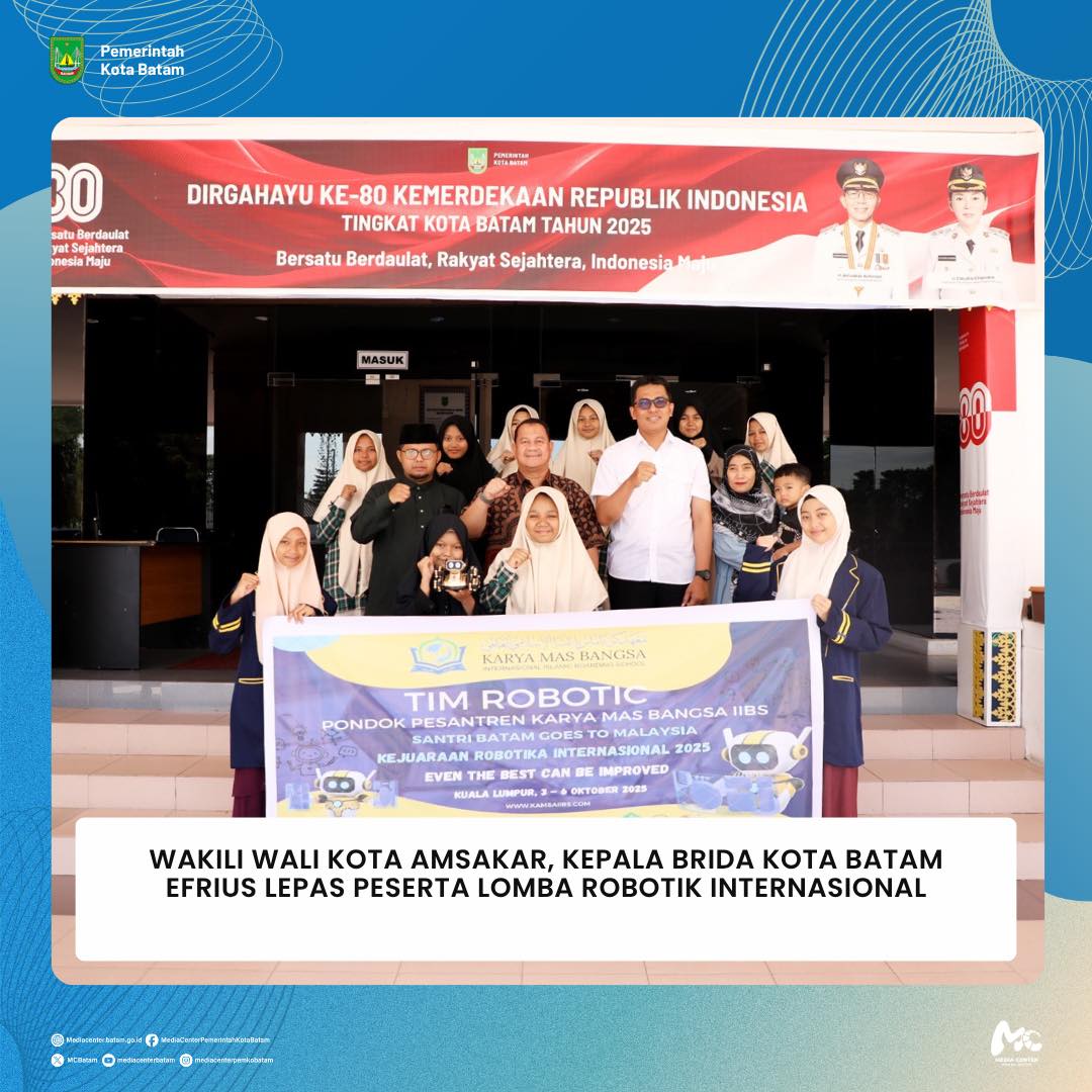 Batam – Wali Kota Batam Amsakar Achmad melalui Kepala Badan Riset dan Inovasi Daerah (Brida) Kota Batam, Efrius, secara resmi melepas sejumlah santriwan dari Pondok Pesantren Karya Mas Bangsa IIBS Batam untuk mengikuti lomba robotik internasional di Kuala Lumpur, Malaysia. Acara pelepasan berlangsung di Kantor Wali Kota Batam, Kamis (2/10/2025).