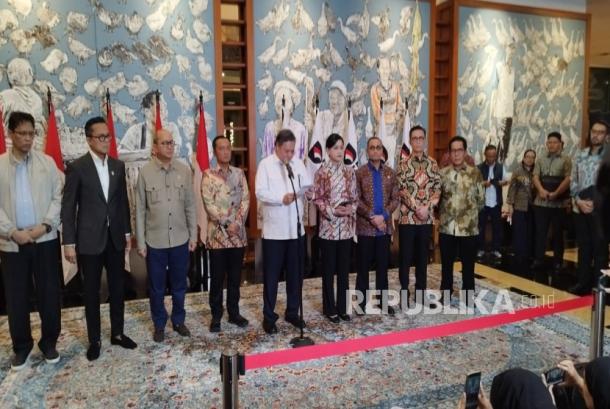 Menteri Koordinator bidang Perekonomian Airlangga Hartarto, Menteri Sekretaris Negara Prasetyo Hadi, Menteri Keuangan Purbaya Yudhi Sadewa, CEO Danantara Rosan Roeslani, COO Danantara Dony Oskaria, hingga Anggota Dewan Komisioner Pengganti Ketua dan Wakil Ketua Dewan Komisioner OJK Friderica Widyasari Dewi dalam konferensi pers di di Wisma Danantara, Jakarta, Sabtu (31/1/2026). – (/Subhan Zainuri Ikhsan)