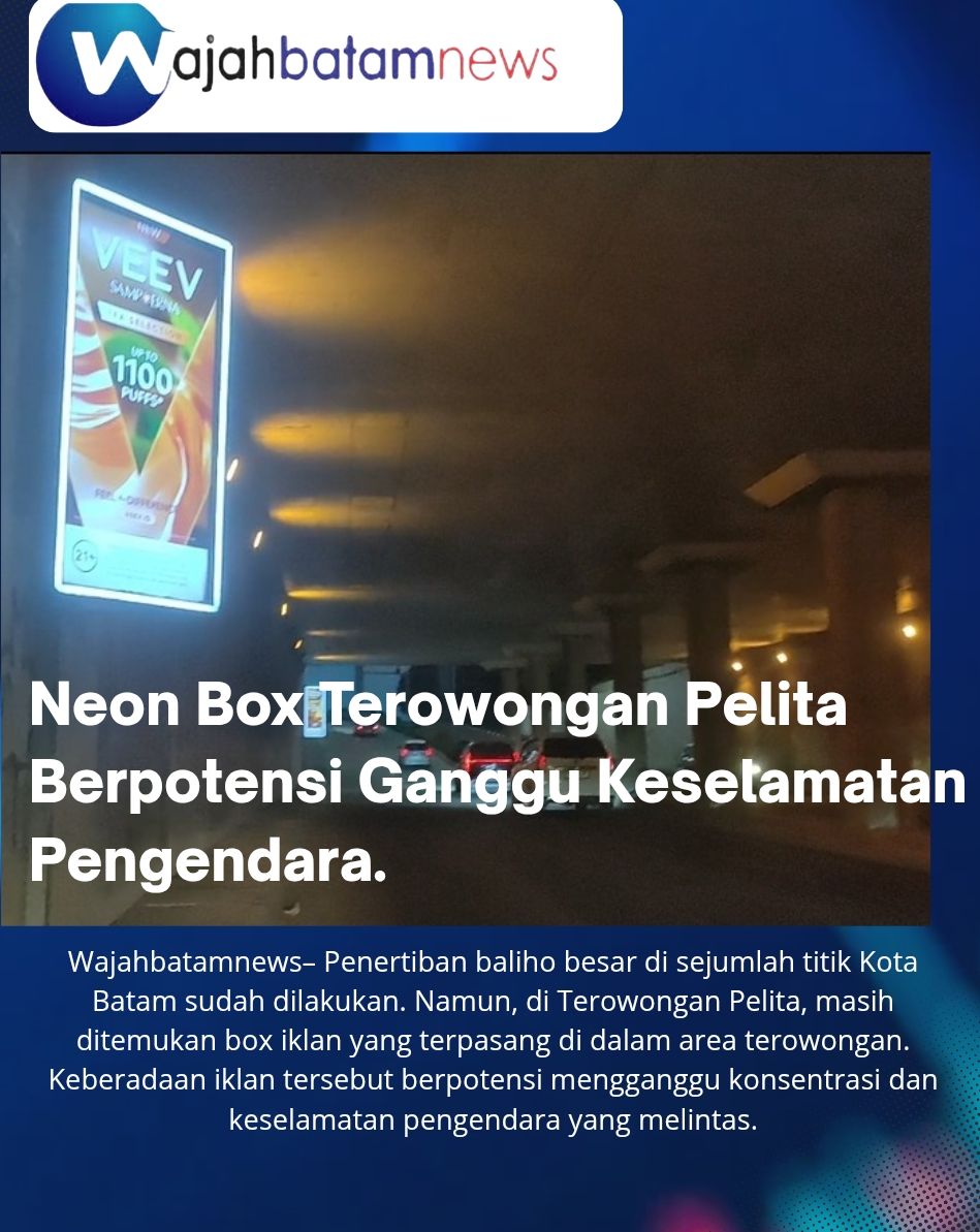 Wajahbatamnews– Penertiban baliho besar di sejumlah titik Kota Batam sudah dilakukan. Namun, di Terowongan Pelita, masih ditemukan box iklan yang terpasang di dalam area terowongan. Keberadaan iklan tersebut berpotensi mengganggu konsentrasi dan keselamatan pengendara yang melintas.